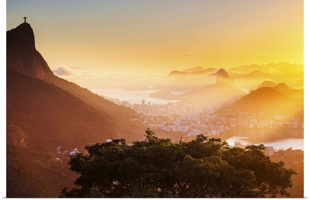 <p>Brazil, Rio de Janeiro, Corcovado, Christ the Redeemer, City at sunrise with Corcovado, Cristo Redentor, Sugarloaf Mountain and Lagoa Rodrigo de Freitas, view from Foresta da Tijuca,.</p>