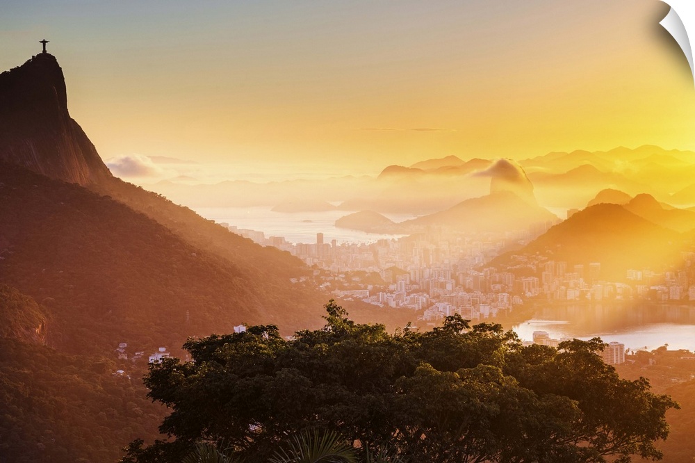 <p>Brazil, Rio de Janeiro, Corcovado, Christ the Redeemer, City at sunrise with Corcovado, Cristo Redentor, Sugarloaf Mountain and Lagoa Rodrigo de Freitas, view from Foresta da Tijuca,.</p>