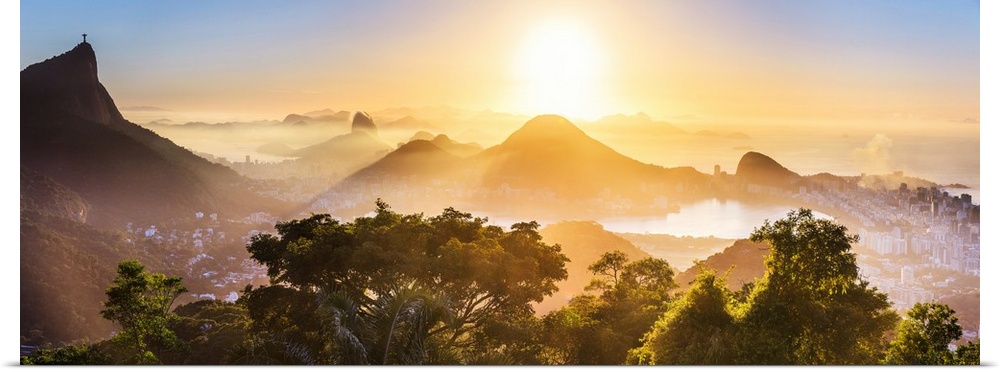 <p>Brazil, Rio de Janeiro, Corcovado, Christ the Redeemer, City at sunrise, Corcovado, Cristo Redentor, Sugarloaf Mountain, Lagoa Rodrigo de Freitas and Ipanema Beach, view from Foresta da Tijuca.</p>