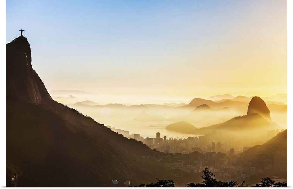 <p>Brazil, Rio de Janeiro, Corcovado, Christ the Redeemer, City at sunrise with Corcovado, Cristo Redentor and Sugarloaf Mountain, view from Foresta da Tijuca.</p>