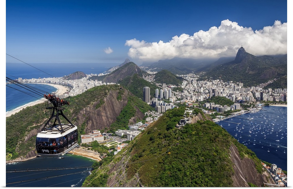 <p>Brazil, Rio de Janeiro, Teleferico, view towards Guanabara Bay, Praia Vermelha, Copacabana Beach, Botafogo, Flamengo Beach and Corcovado, view from Sugarloaf Mountain.</p>