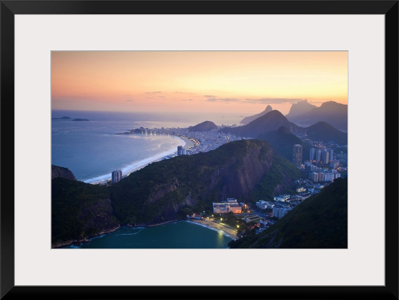 <p>Brazil, Rio De Janeiro, Urca, Sugar Loaf Mountain, view of Vermelha beach and Copacabana at twilight</p>