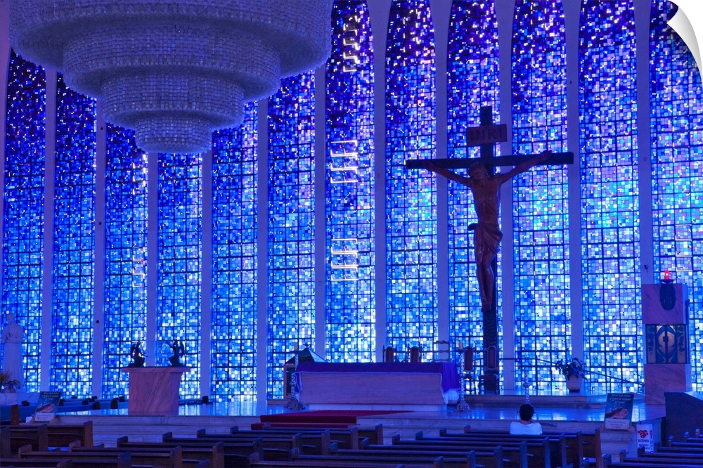 <p>South America, Brazil, Brasilia, Distrito Federal, the Santuario Dom Bosco church showcasing the stained glass by architect Cl..udio Naves and Hubert Van Doorne, the crucifix by Gotfredo Traller and a 3 tonne chandelier by Alvimar Moreira</p>
