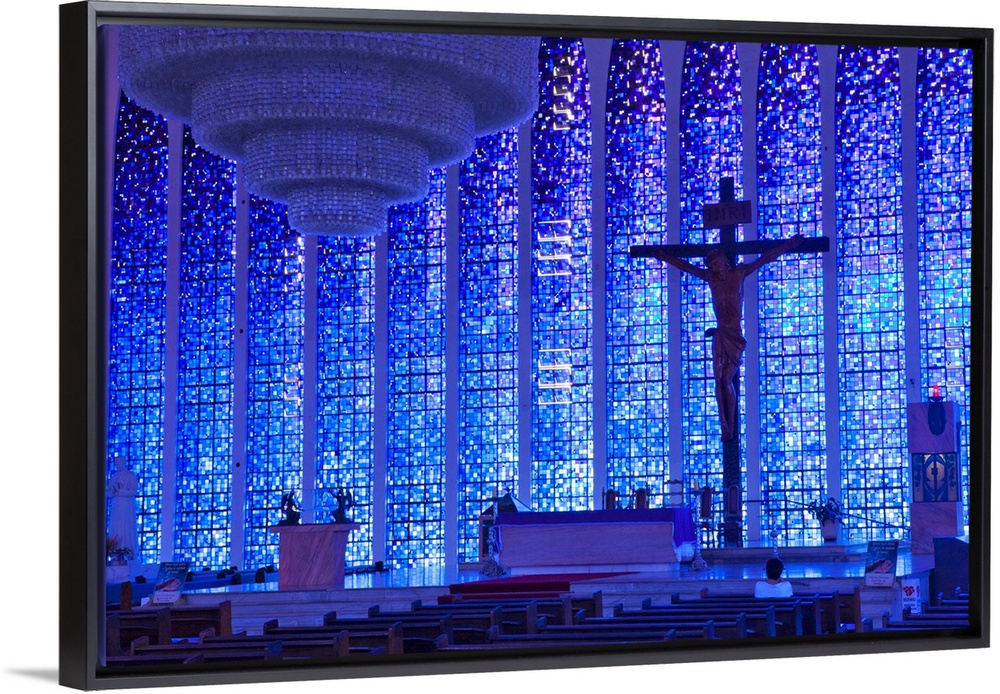 <p>South America, Brazil, Brasilia, Distrito Federal, the Santuario Dom Bosco church showcasing the stained glass by architect Cl..udio Naves and Hubert Van Doorne, the crucifix by Gotfredo Traller and a 3 tonne chandelier by Alvimar Moreira</p>