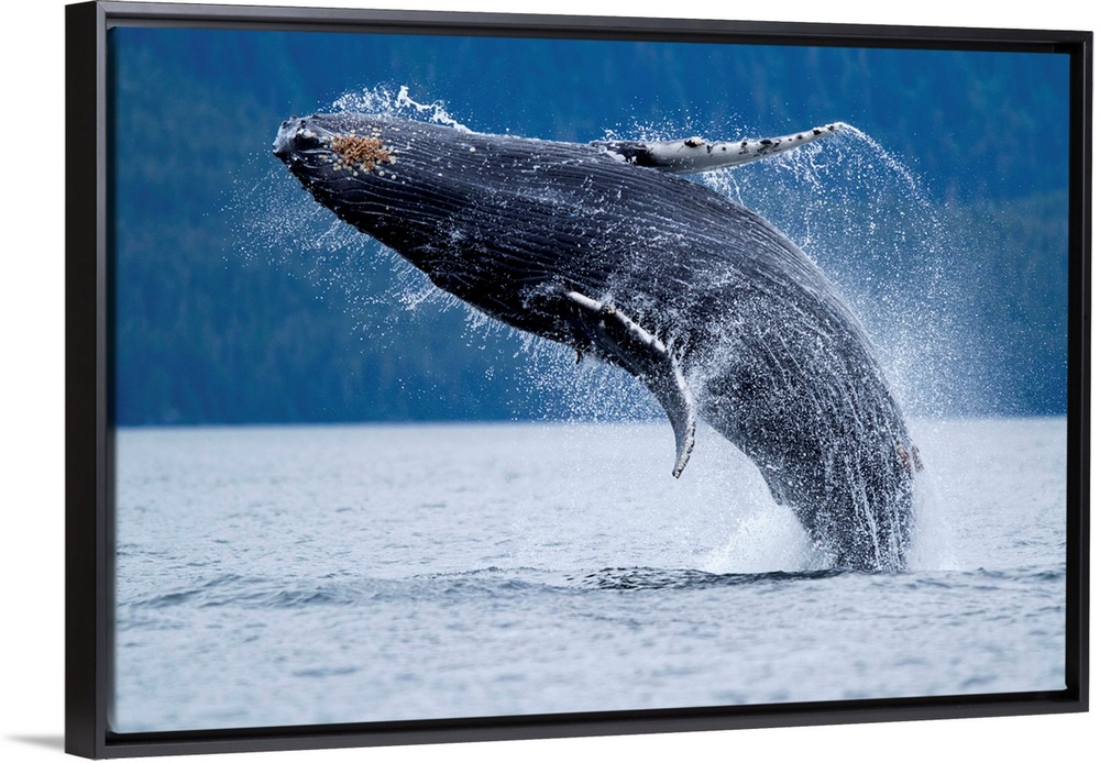 <p>USA, Alaska, Tongass National Forest, Young Humpback Whale Calf (Megaptera novaengliae) breaching in Frederick Sound on summer day. Photograph by Paul Souders.</p>