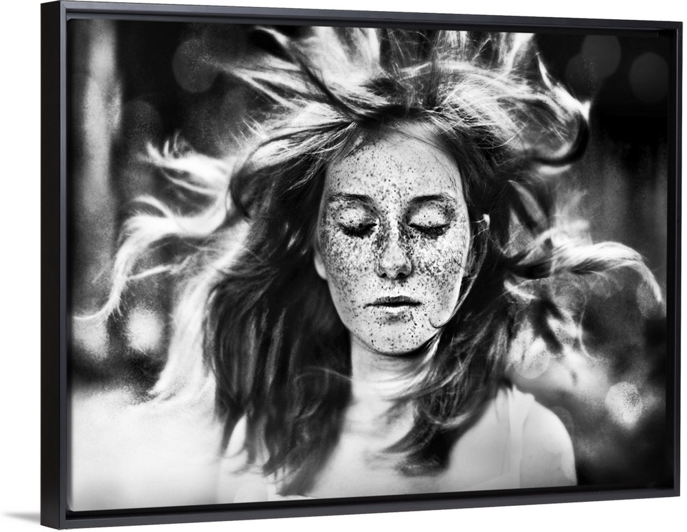 <p>A freckled young woman with closed eyes and her hair blowing in the wind.</p>