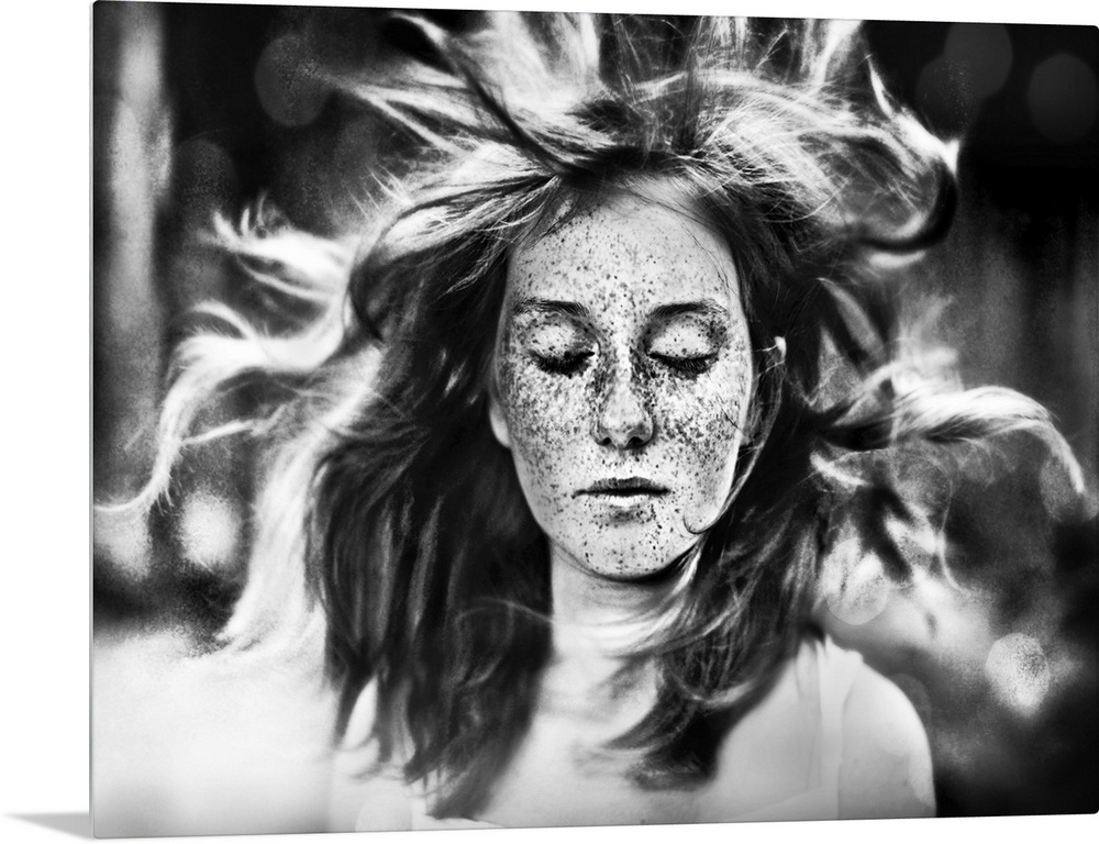 <p>A freckled young woman with closed eyes and her hair blowing in the wind.</p>
