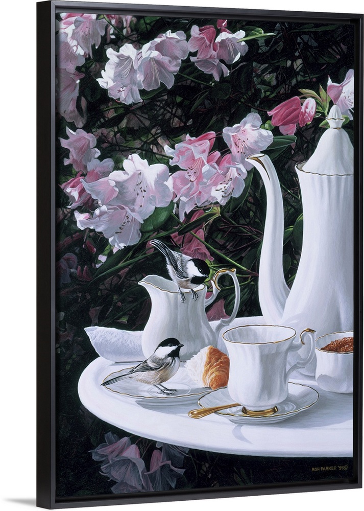 <p>breakfast tray with one bird perched on the creamer and one perched on a plate with part of a croissant.</p>