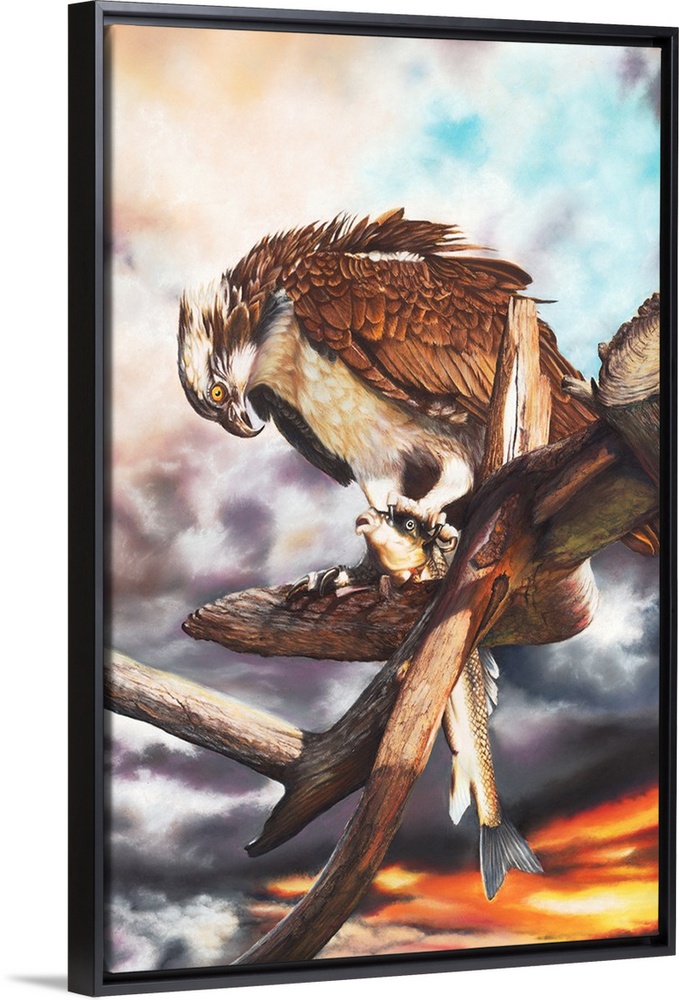 <p>An Osprey feeding on a large fish in a deadwood tree before a dramatic sky. Created with pastels on card.</p>