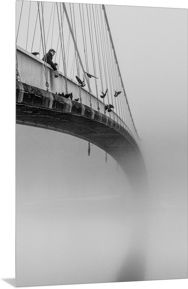 <p>Man feeding pigeons from the edge of a suspension bridge, fading into the fog.</p>