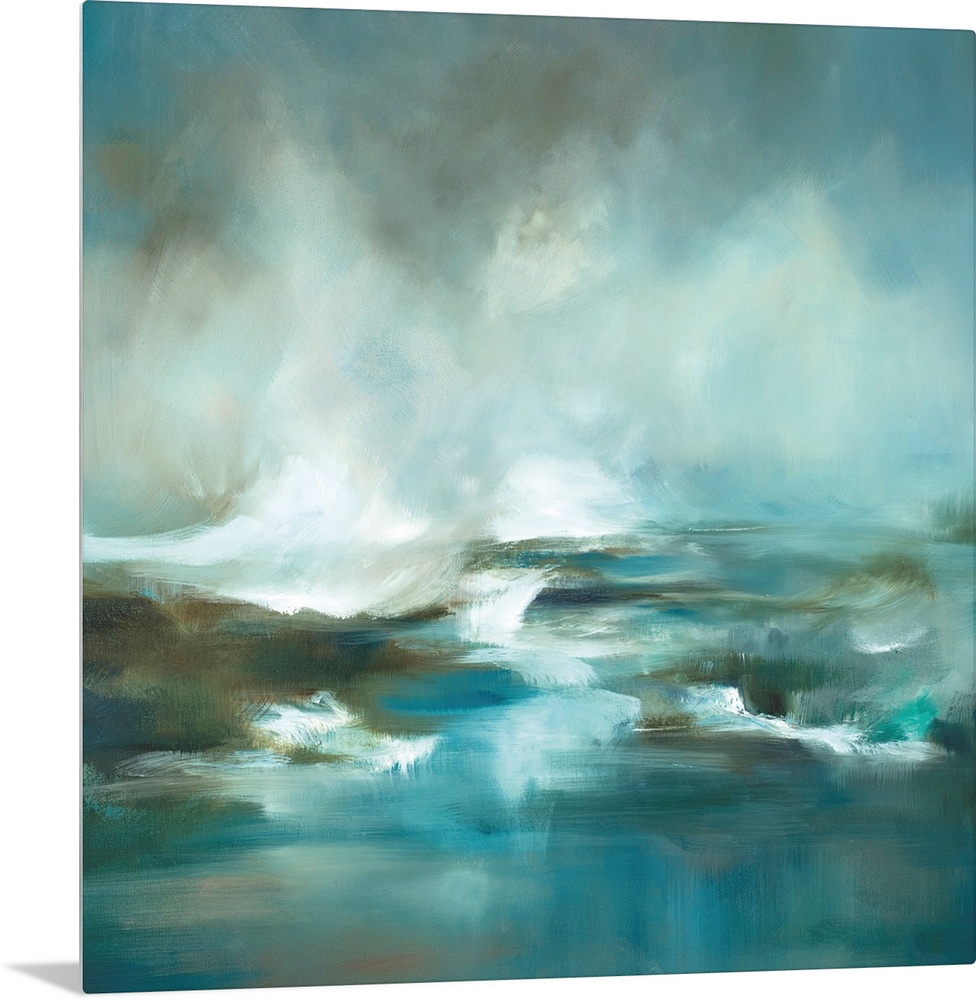 <p>Square painting of ocean waves in tones of blue, white and brown.</p>