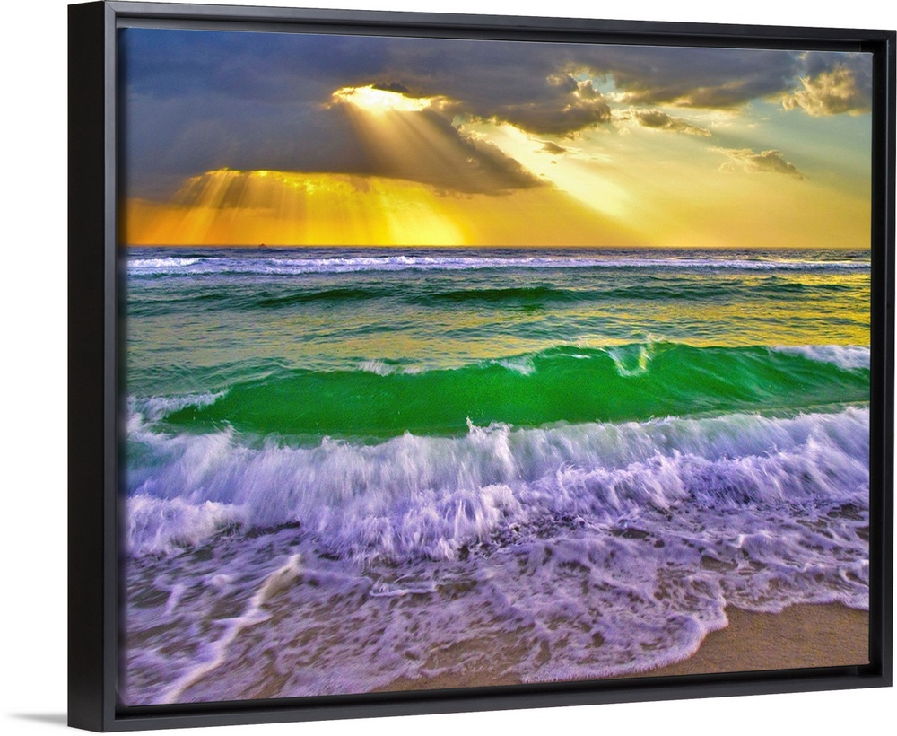 <p>Emerald green breaking waves at sunset crash under golden sunrays. Taken in Fort Walton Beach Florida.</p>