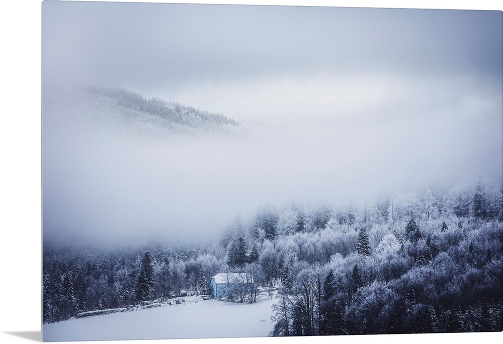 <p>Landscape of snow-covered fir trees in the middle of the mist</p>