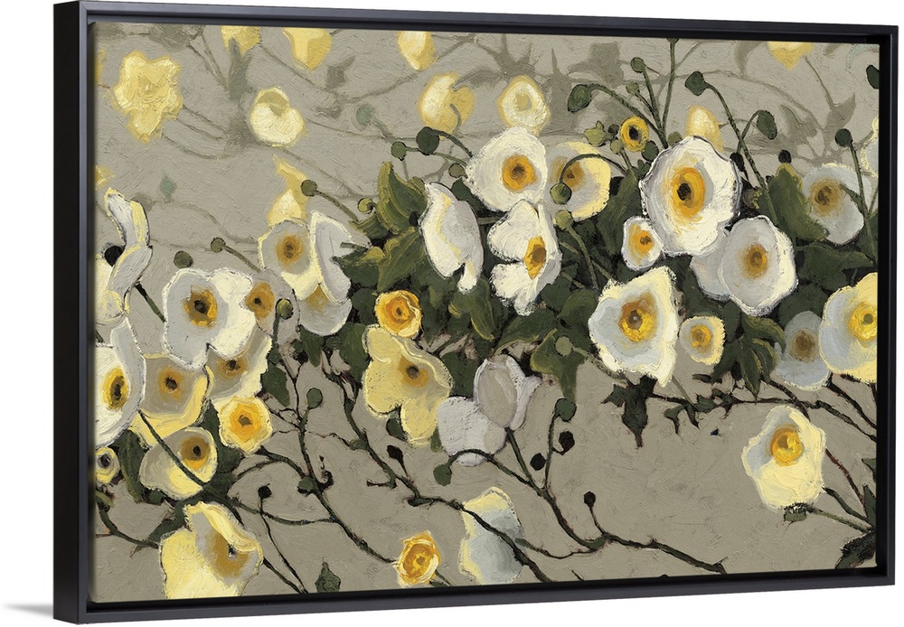 <p>Contemporary painting of garden flowers in yellow and white against a putty gray background.</p>
