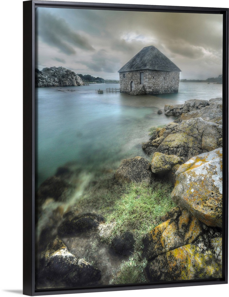 <p>Old mill house called Moulin du Birlot, on Brehat Island in Brittany, in France at high tide, vertical view with rocks at first plan, a dark sky on the background.</p>