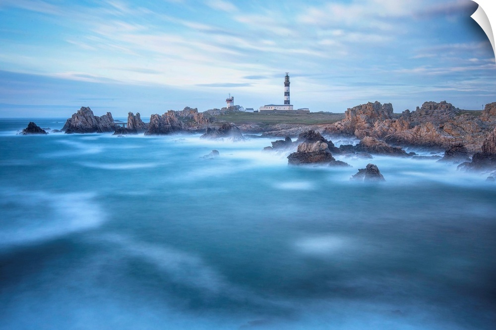<p>Fine art photo of a lighthouse on a rocky coast with a cloudy sky and deep blue ocean.</p>