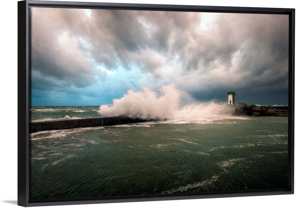 <p>A photograph of a lighthouse in France being hit with crashing waves.</p>