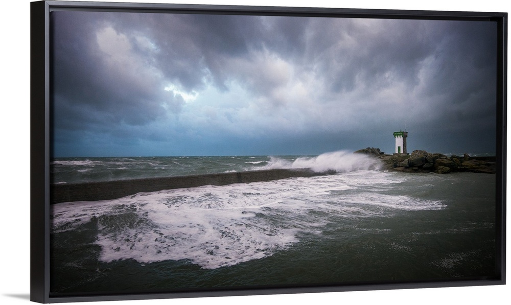 <p>A photograph of the French coast with a lighthouse in the distance under a sky filled with ominous clouds.</p>