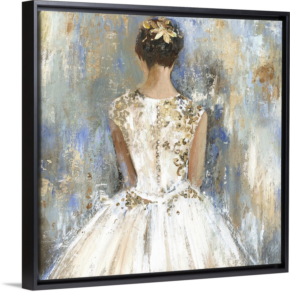 <p>Square painting of the backside of a female bridesmaid in a dress with gold accents against a textured blue and gold backdrop.</p>
