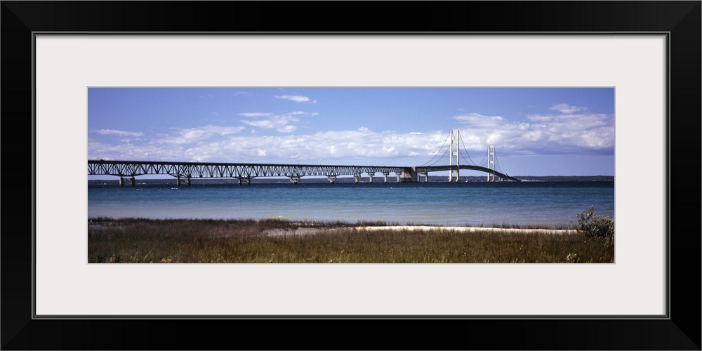 <p>Panoramic view of the Mackinac Bridge across the straits of Mackinac in Mackinaw City, Michigan.</p>