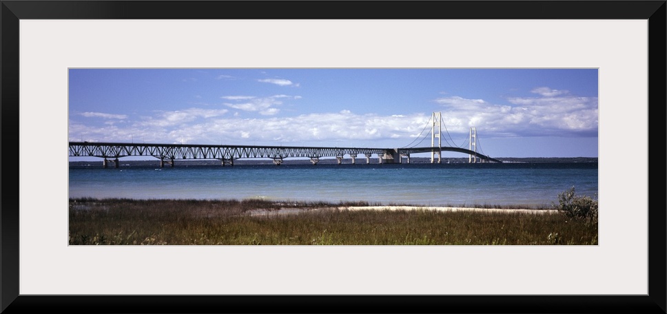 <p>Panoramic view of the Mackinac Bridge across the straits of Mackinac in Mackinaw City, Michigan.</p>