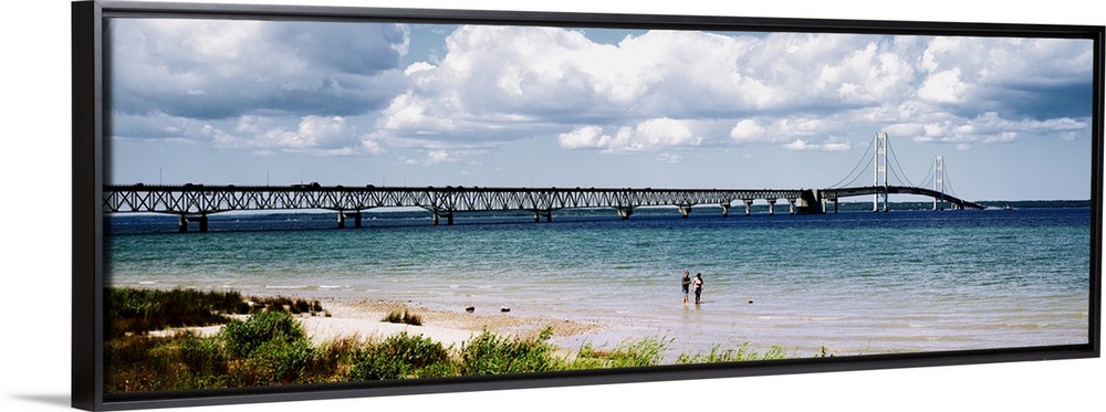 <p>Panoramic picture of a massive bridge that stretches across a lake in Michigan. Some beach on the lake can be seen with two people standing ankle deep in the water.</p>