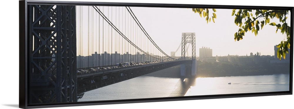 <p>The sun sets off in the distance over the George Washington bridge which is photographed in wide angle view during a busy commute.</p>