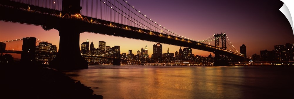 <p>Panoramic photograph of overpass crossing body of water, connecting two cities at sunset. The city skyline is in the distance and the bridge and buildings are lit up in the night sky.</p>