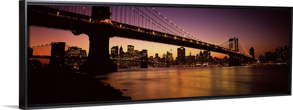 <p>Panoramic photograph of overpass crossing body of water, connecting two cities at sunset. The city skyline is in the distance and the bridge and buildings are lit up in the night sky.</p>