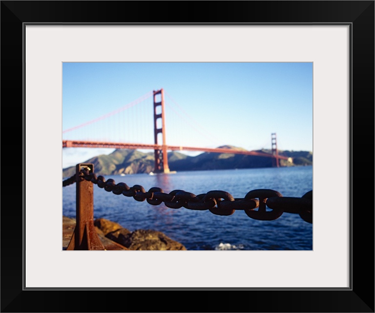 <p>Large, landscape photograph of a chain running on the top of a retaining wall near the San Francisco Bay, the Golden Gate Bridge is softly out of focus in the background, mountains just behind, on the horizon.</p>