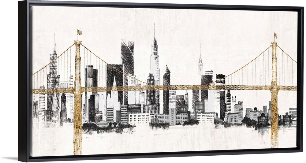 <p>Contemporary painting in black and gold of the Manhattan Bridge in front of the New York City skyline.</p>