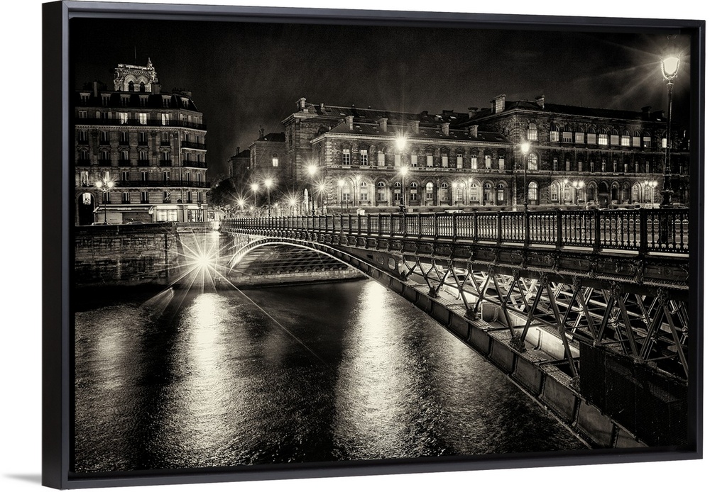 <p>High contrast photograph of a bridge crossing over the Seine River in Paris with lit up buildings in the night sky background.</p>