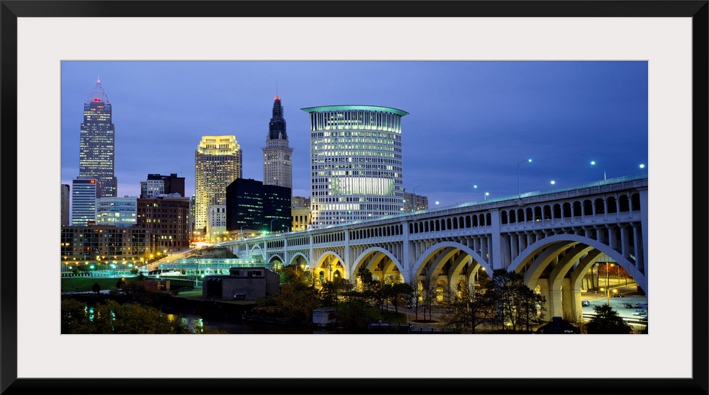 <p>A big canvas print of a long bridge entering a lit up city with building lights against a dusk sky.</p>