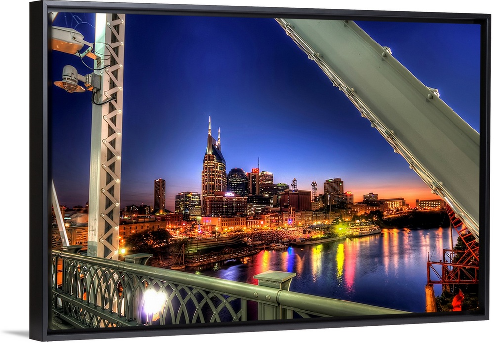 <p>Large wall docor overlooking a lit up downtown cityscape from a bridge at dusk with a river running below it.</p>