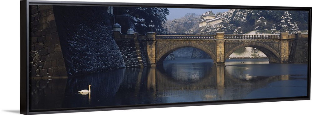 <p>Panoramic photograph of the stone Bridge Nijubashi over calm waters, surrounded by a snow covered landscape as a swan floats gracefully in the foreground.</p>