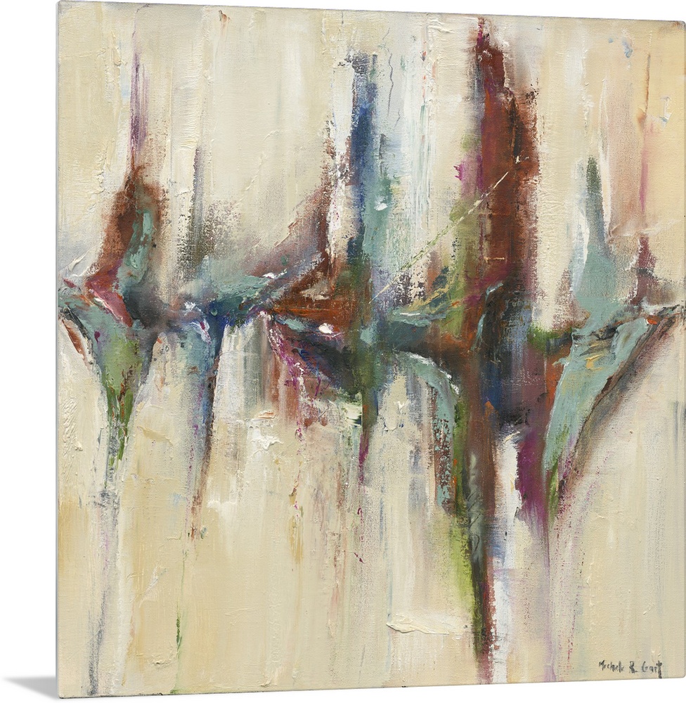 <p>Square abstract painting with colorful brushstrokes in the middle resembling a reflection.</p>