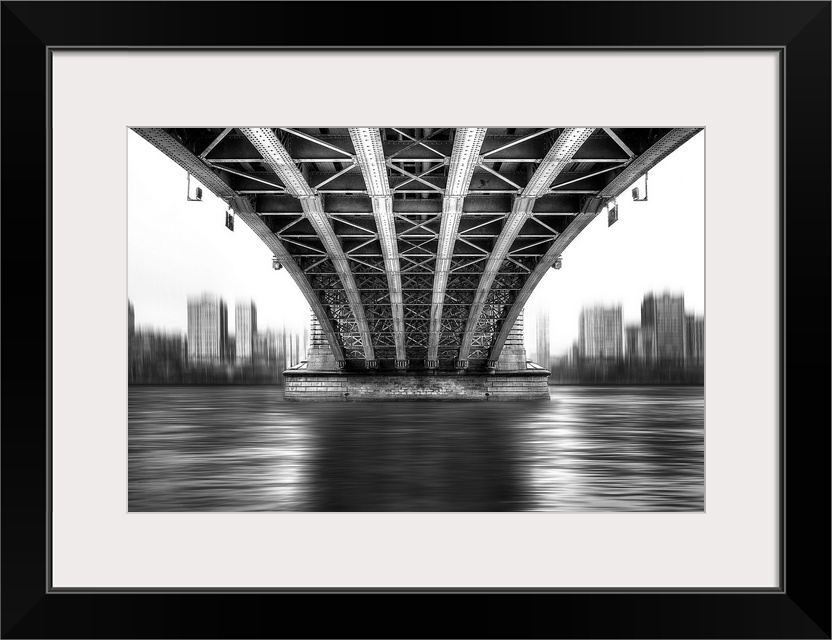 <p>A black and white photograph from under a large bridge looking across the river it spans to see a city skyline.</p>