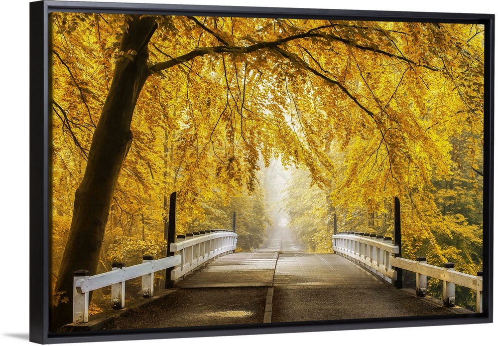 <p>Beautiful fall landscape of a bridge and road going off in the distance, surrounded by bright yellow leafed trees.</p>