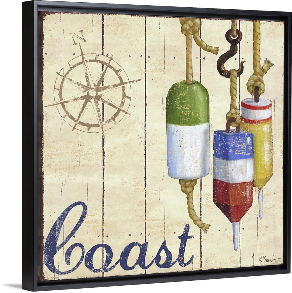 <p>Painted nautical sign on wood panels with a compass rose, buoys, and the word Coast.</p>