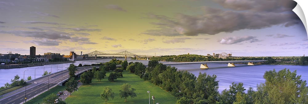 <p>Bridges across a river, Jacques Cartier Bridge, Pont De La Concorde, Montreal, Quebec, Canada</p>