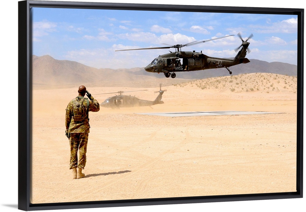 <p>August 4, 2012 - Brigade aviation officer salutes as a UH-60 Black Hawk helicopter lifts off from forward operating base Denver at the National Training Center.</p>