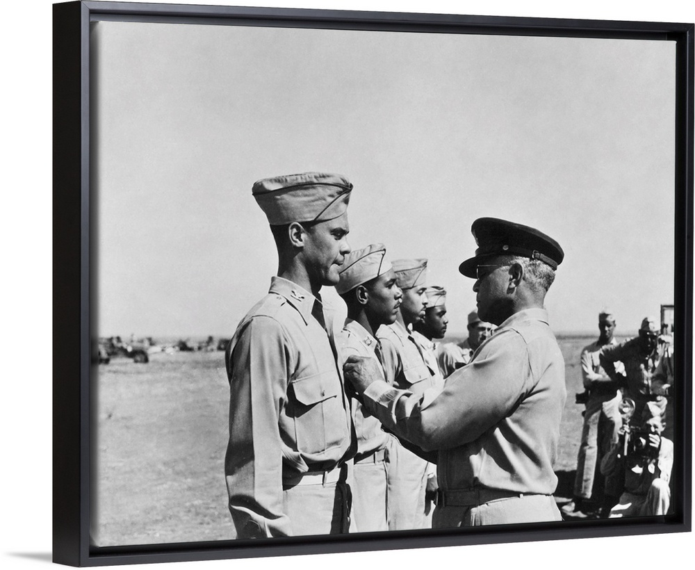 <p>Brigadier General Benjamin Oliver Davis, Sr. pins the Distinguished Flying Cross on his son, Benjamin O. Davis, Jr., while Joseph Elsberry, Jack Holsclaw, Clarence Lester await their turn, in Italy, 1944.</p>