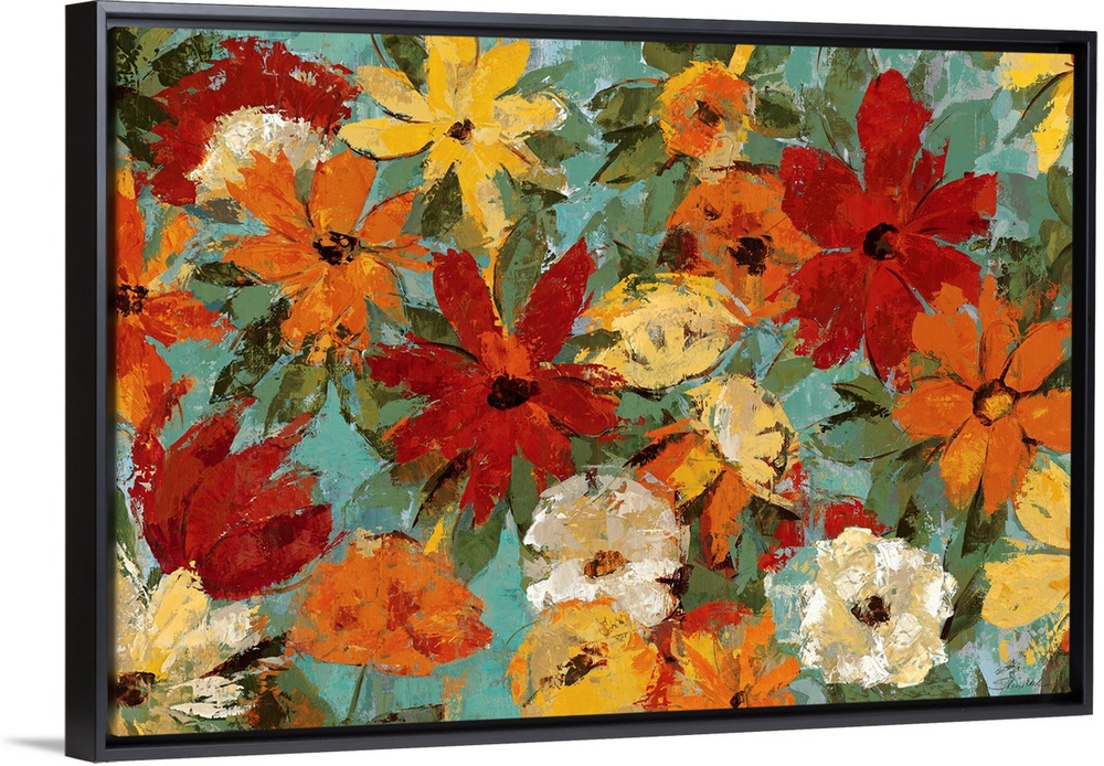 <p>Decorative artwork perfect for the home of warm toned painted flowers against a greenish blue background.</p>