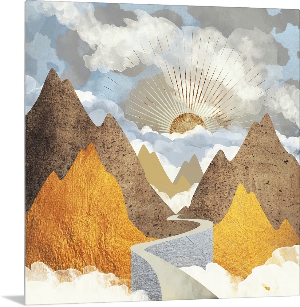<p>Abstract depiction of a valley vista landscape with mountains and gold.</p>