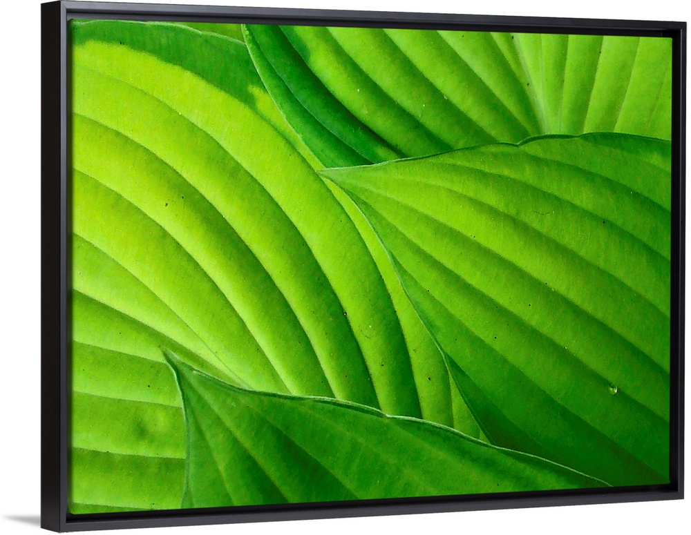 <p>Bright green hosta leaves, clearly showing veins and leaf shapes.</p>