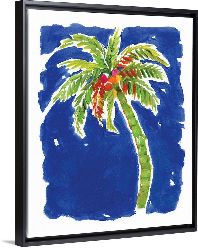 <p>A decorative painting of a green palm tree with coconuts that has hints of red, orange, yellow, and pink on a bright blue background.</p>