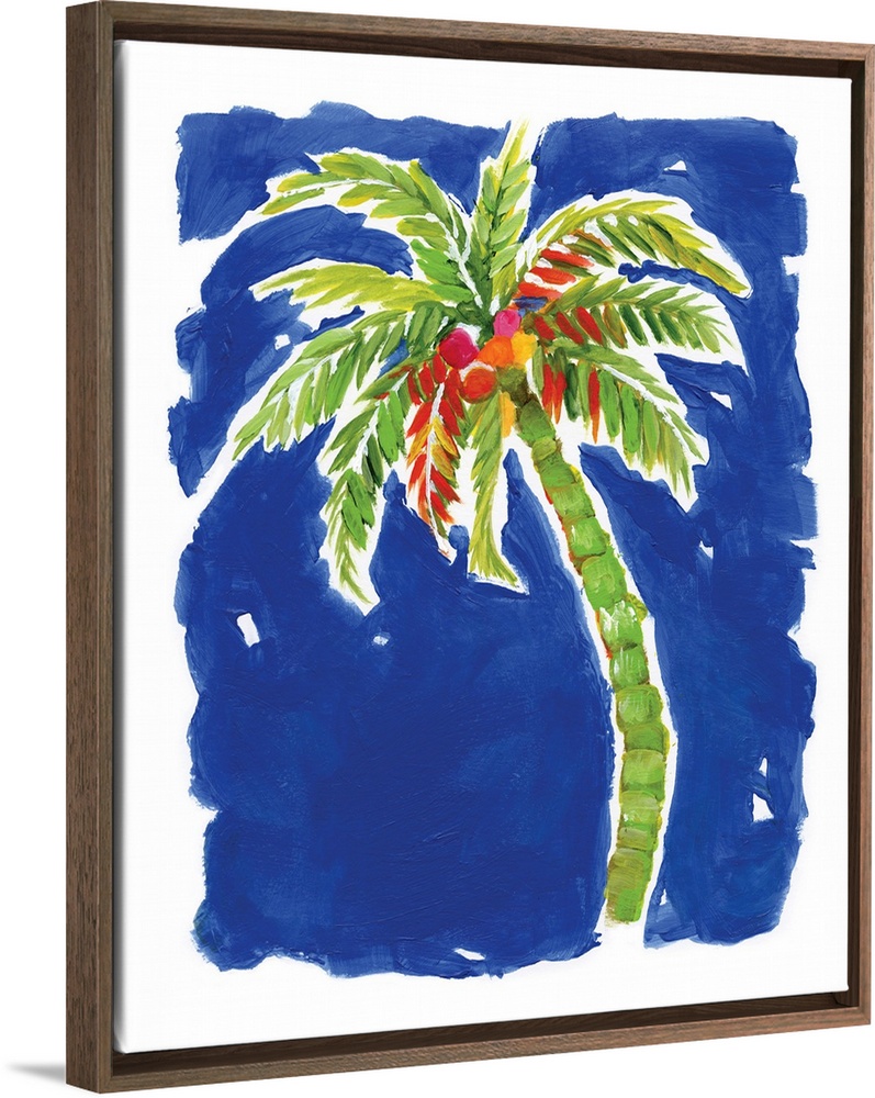 <p>A decorative painting of a green palm tree with coconuts that has hints of red, orange, yellow, and pink on a bright blue background.</p>