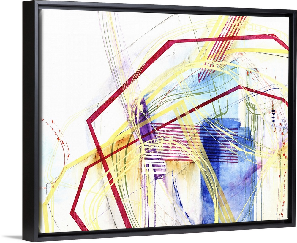 <p>Abstract painting with geometric shapes in red and yellow against colorful brush strokes.</p>