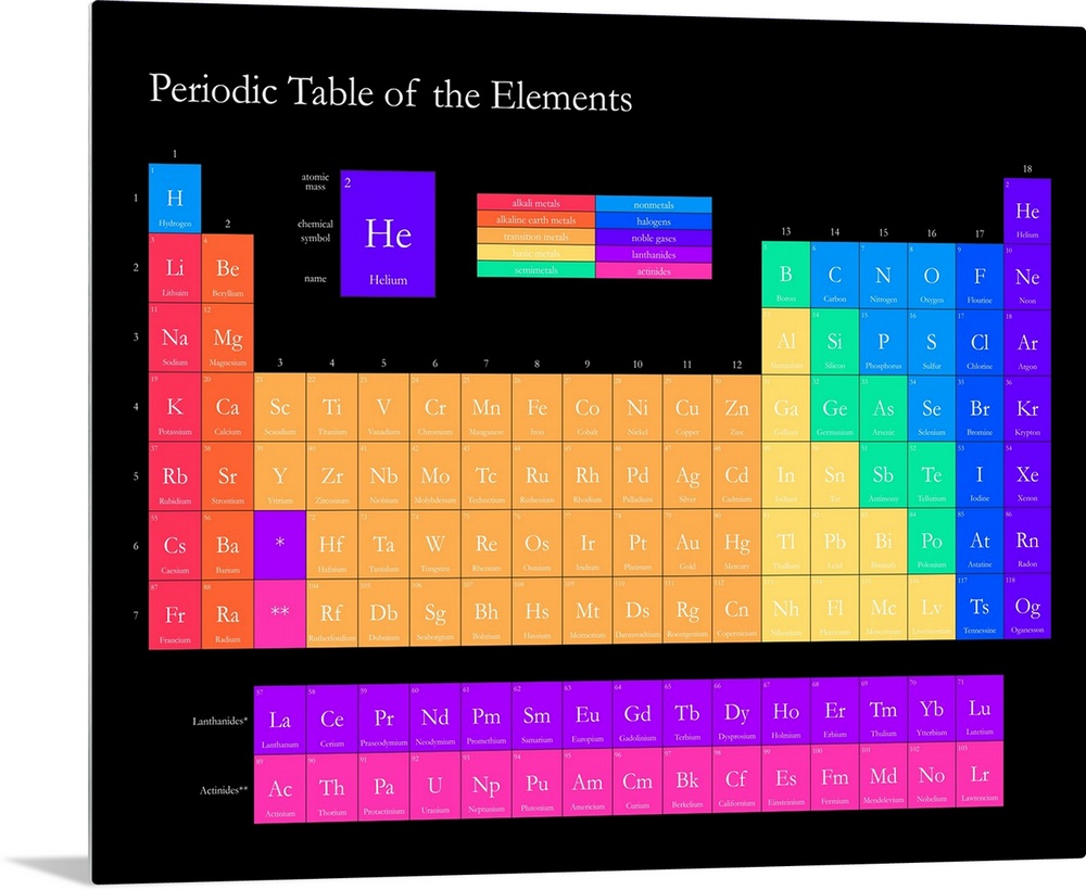 <p>Brightly colored Periodic Table of the Elements, on a black background with classic serif text.</p>
