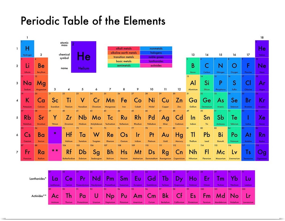 <p>Brightly colored Periodic Table of the Elements, on a white background with modern sans-serif text.</p>